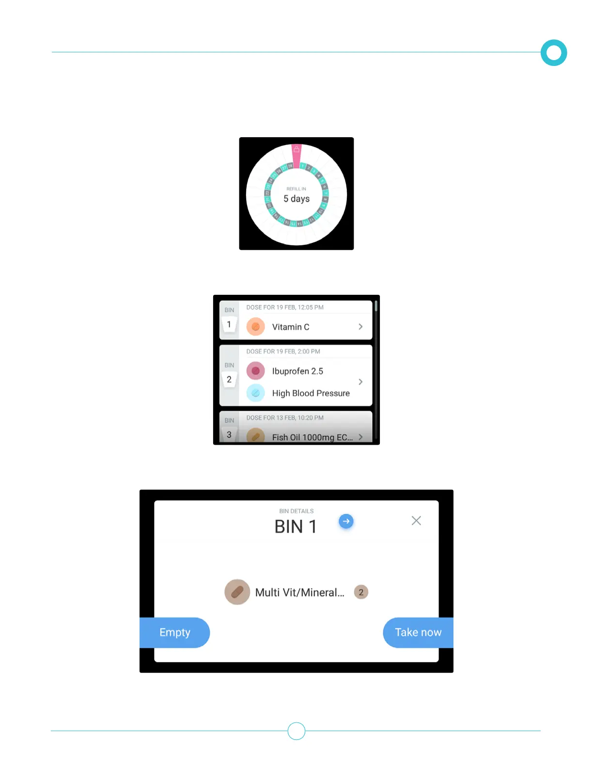 The wheel shows how many bins are lled and how many days are left until the bins need to be relled.