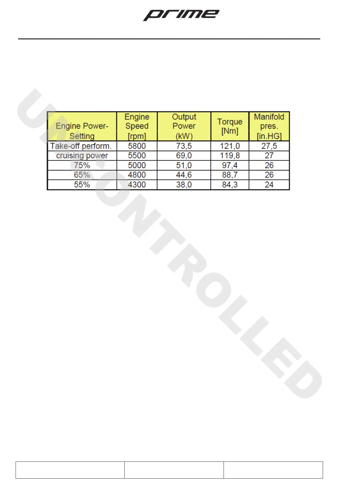 The following table optimizes engine performances as a percentage of power settings compared to the