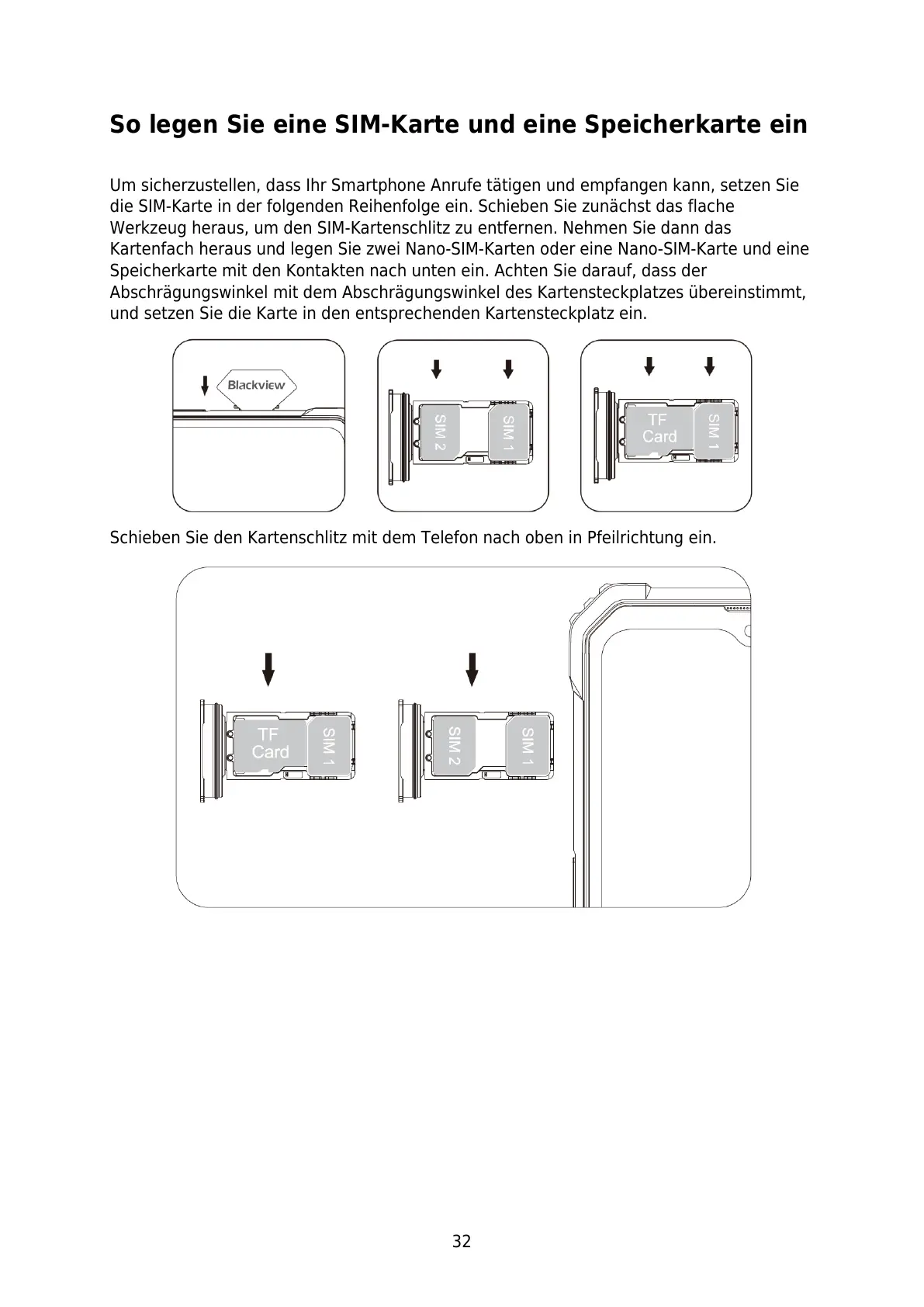 die SIM-Karte in der folgenden Reihenfolge ein. Schieben Sie zunächst das flache