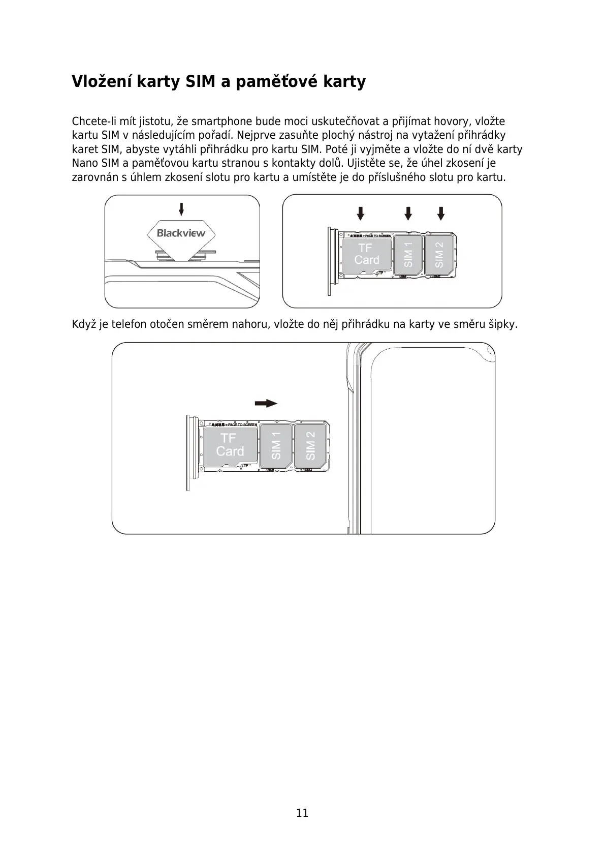 Nano SIM a paměťovou kartu stranou s kontakty dolů. Ujistěte se, že úhel zkosení je