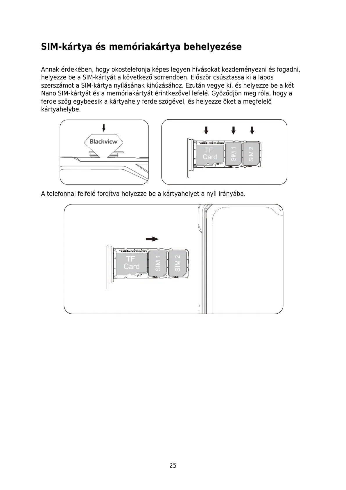 A telefonnal felfelé fordítva helyezze be a kártyahelyet a nyíl irányába.