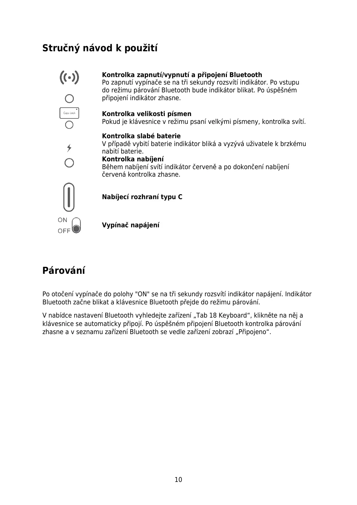 klávesnice se automaticky připojí. Po úspěšném připojení Bluetooth kontrolka párování
