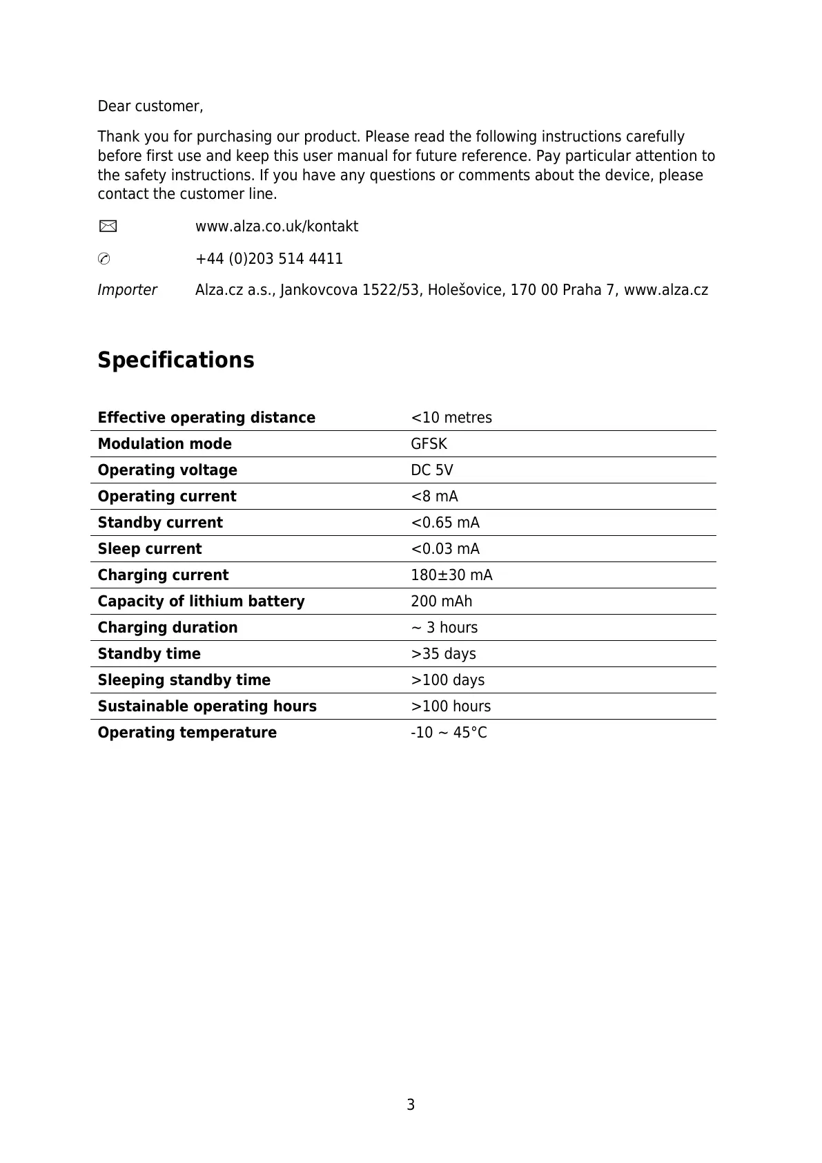 Importer Alza.cz a.s., Jankovcova 1522/53, Holešovice, 170 00 Praha 7, www.alza.cz