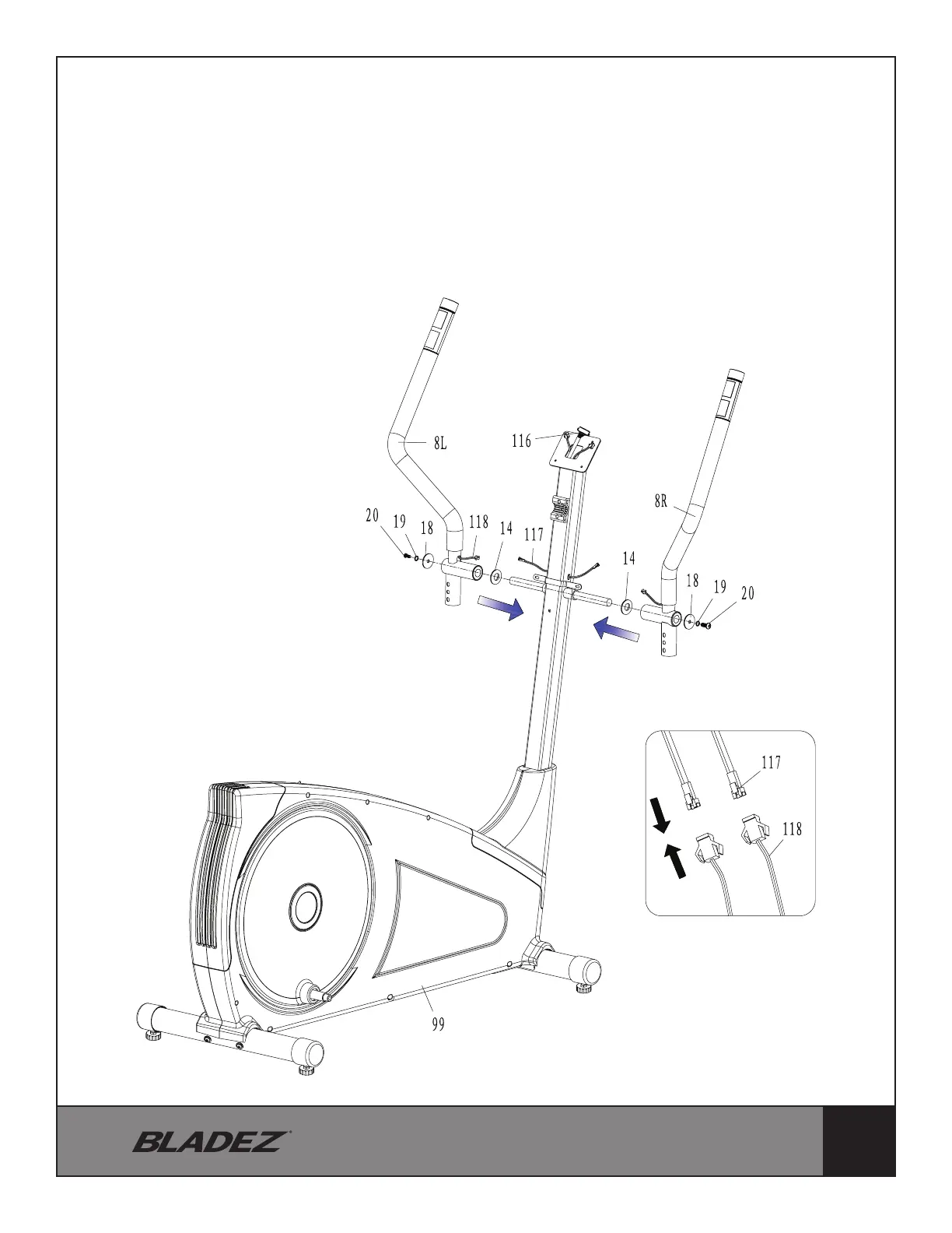 and 2 Allen Bolts (20). Slide the Upper Handlebar (8L+R) onto rotation rod and secure it