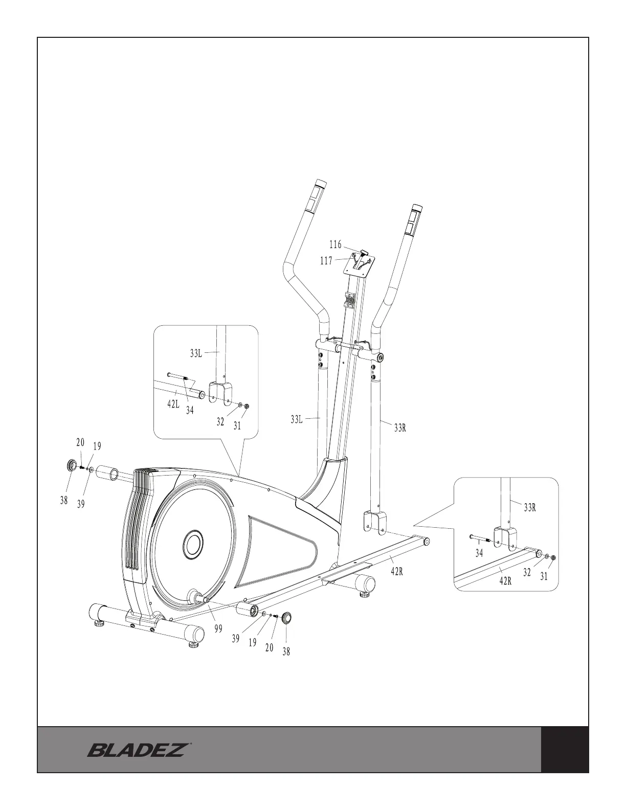 Flat Washer 32) and nylon Nut (31). Attach the left Side Rail (42L) onto the left crank and