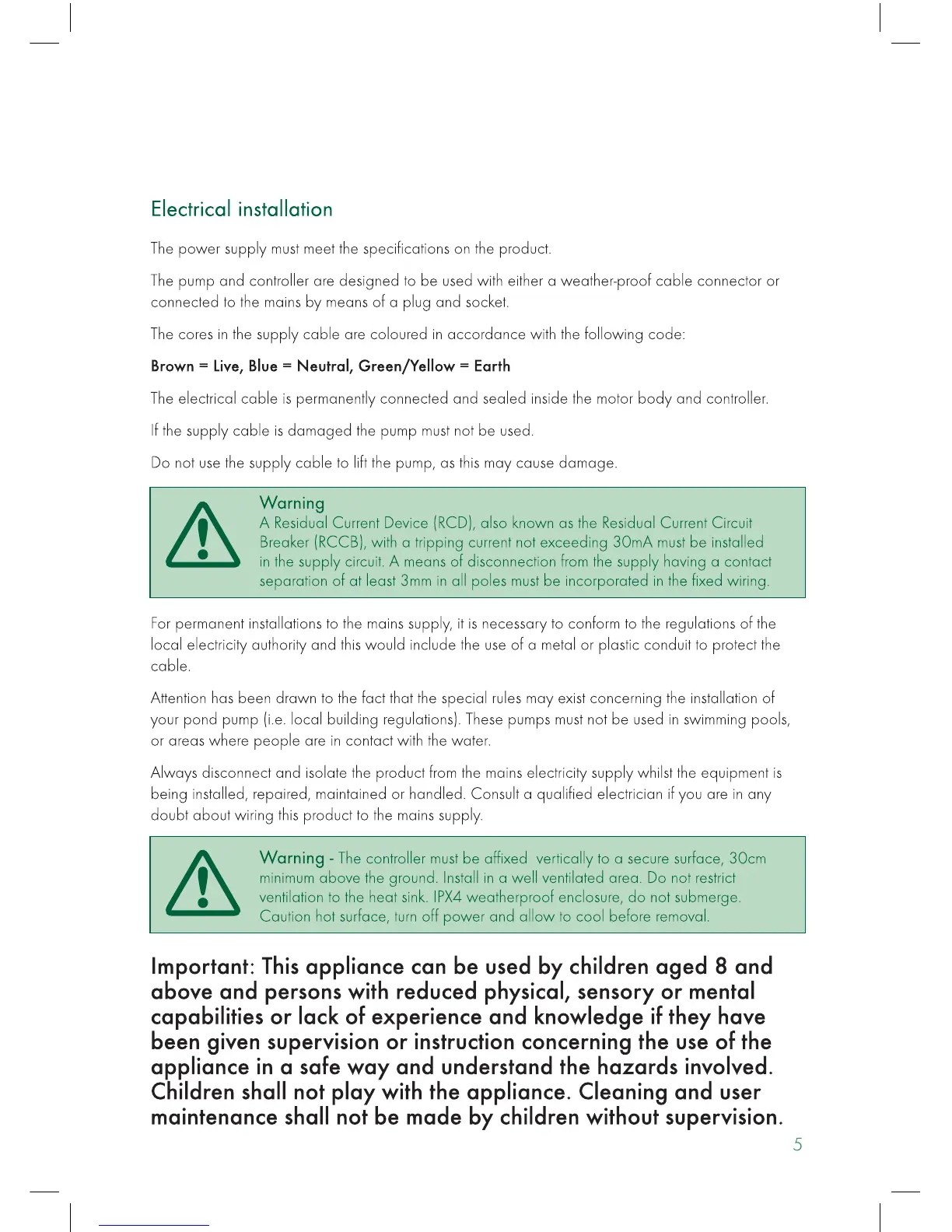 Blagdon 3000-6000 - Electrical Installation; Power Supply and Cable Details; Installation and Usage Safety