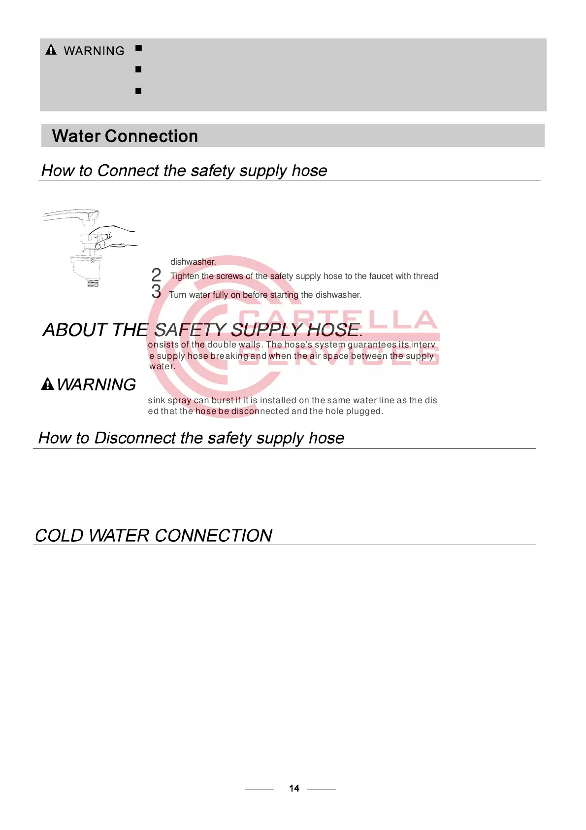 C onnect the cold w ater sup ply hose to a threaded 3/4 (i nch) co nn ector and mak e sure th at i t is fas tened tig htly in p lace.