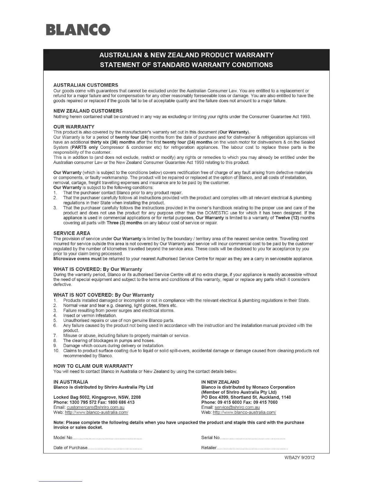 Blanco BIC64F - BLANCO AUSTRALIAN & NEW ZEALAND PRODUCT WARRANTY; Australian Customers; New Zealand Customers; Our Warranty