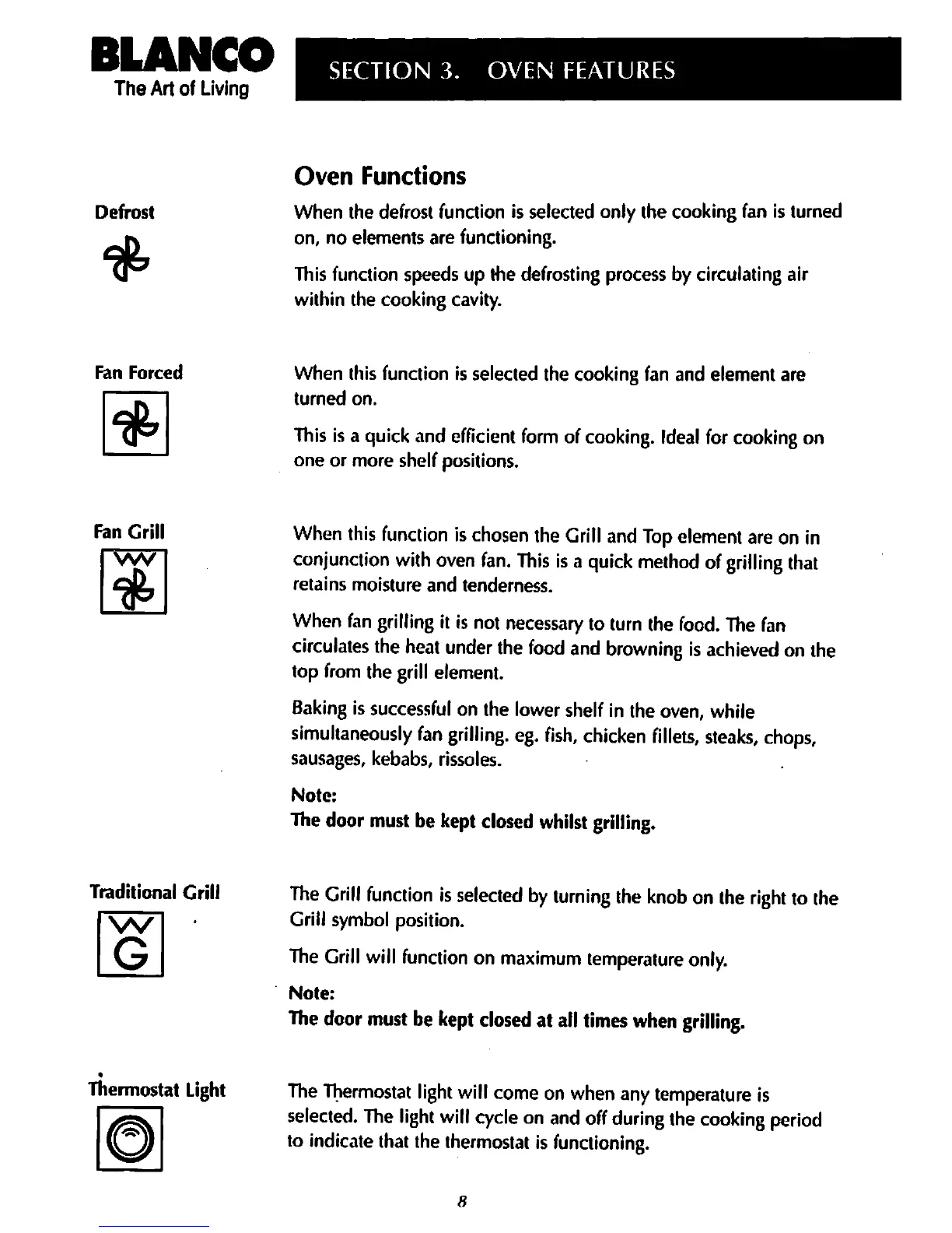 Blanco BSO 640 - Oven Cooking Modes; Thermostat Light