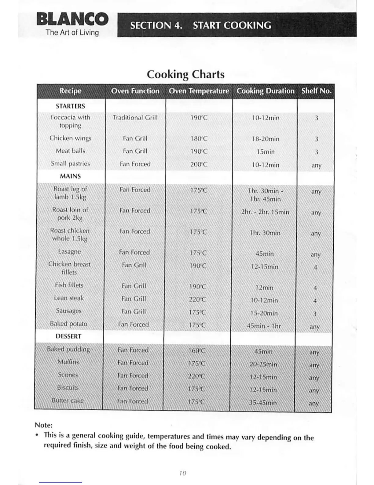 Blanco BSO 640 - Section 4. Start Cooking; Cooking Charts