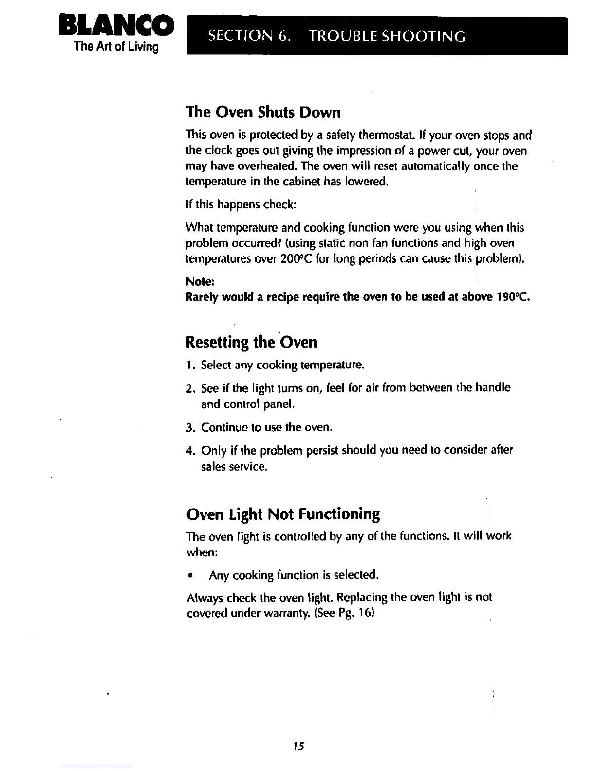 Blanco BSO 640 - Section 6. Trouble Shooting; The Oven Shuts Down; Resetting the Oven; Oven Light Not Functioning