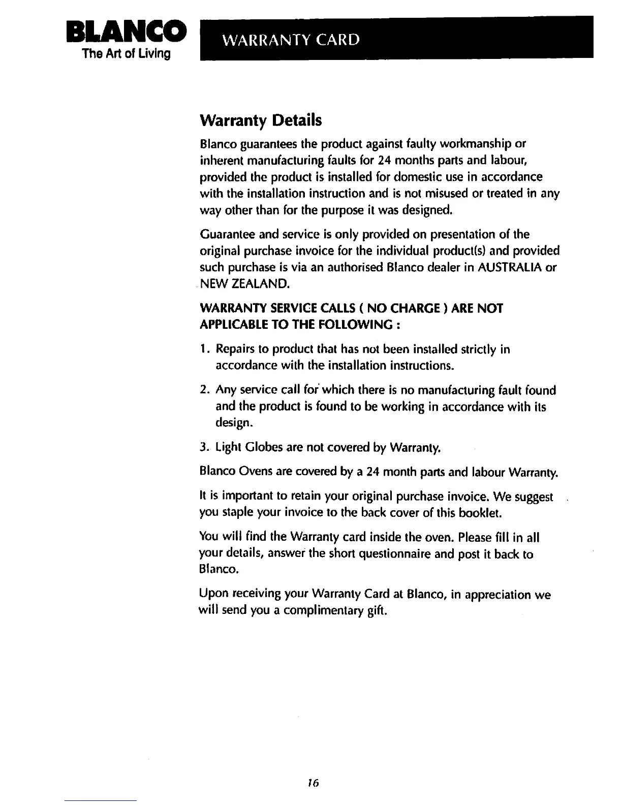 Blanco BSO 640 - Warranty Card; Warranty Details
