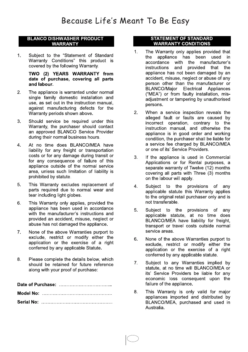 Blanco DWF5X - Blanco Dishwasher Product Warranty; Statement of Standard Warranty Conditions