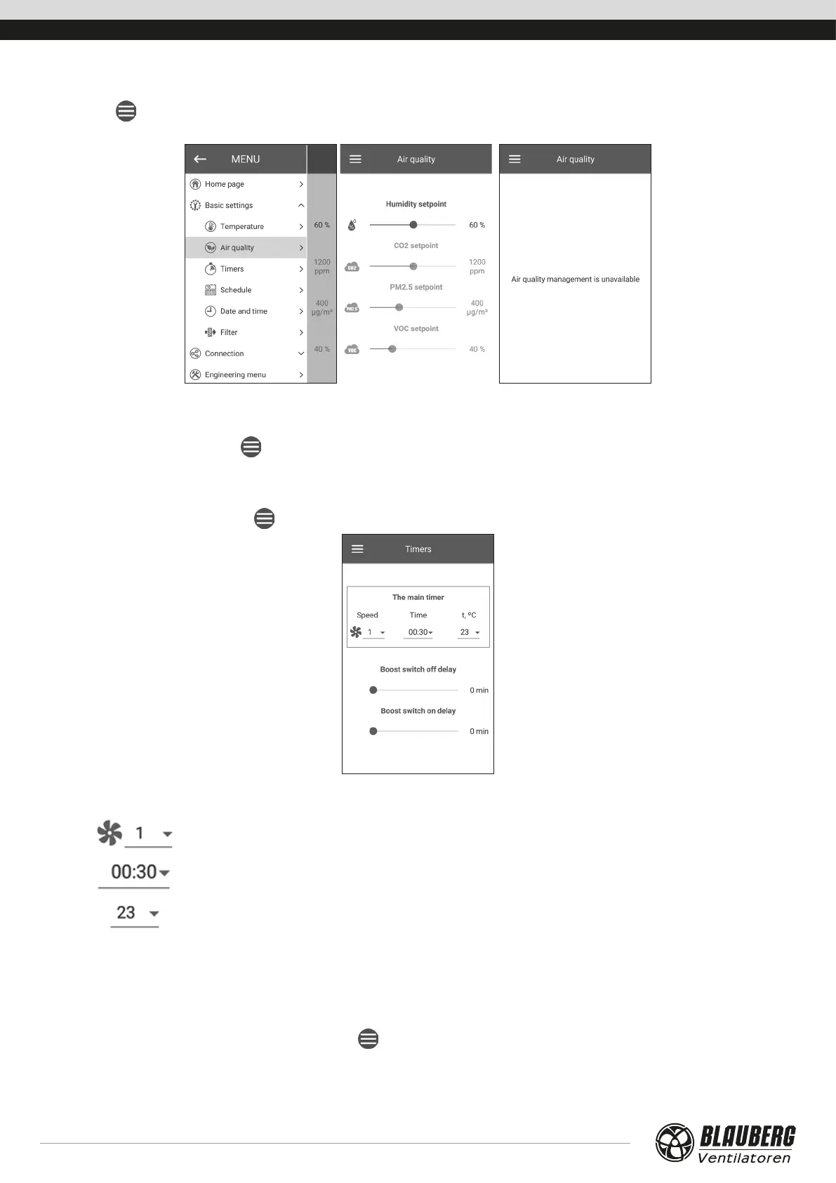Main timer: Timer mode settings. When the timer is activated in the Home page menu, the unit temporarily goes to the following