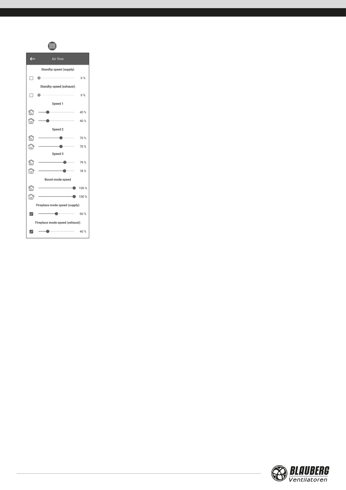 This menu section enables setting the air flow values for the Standby mode, speed 1,2,3 pre-sets