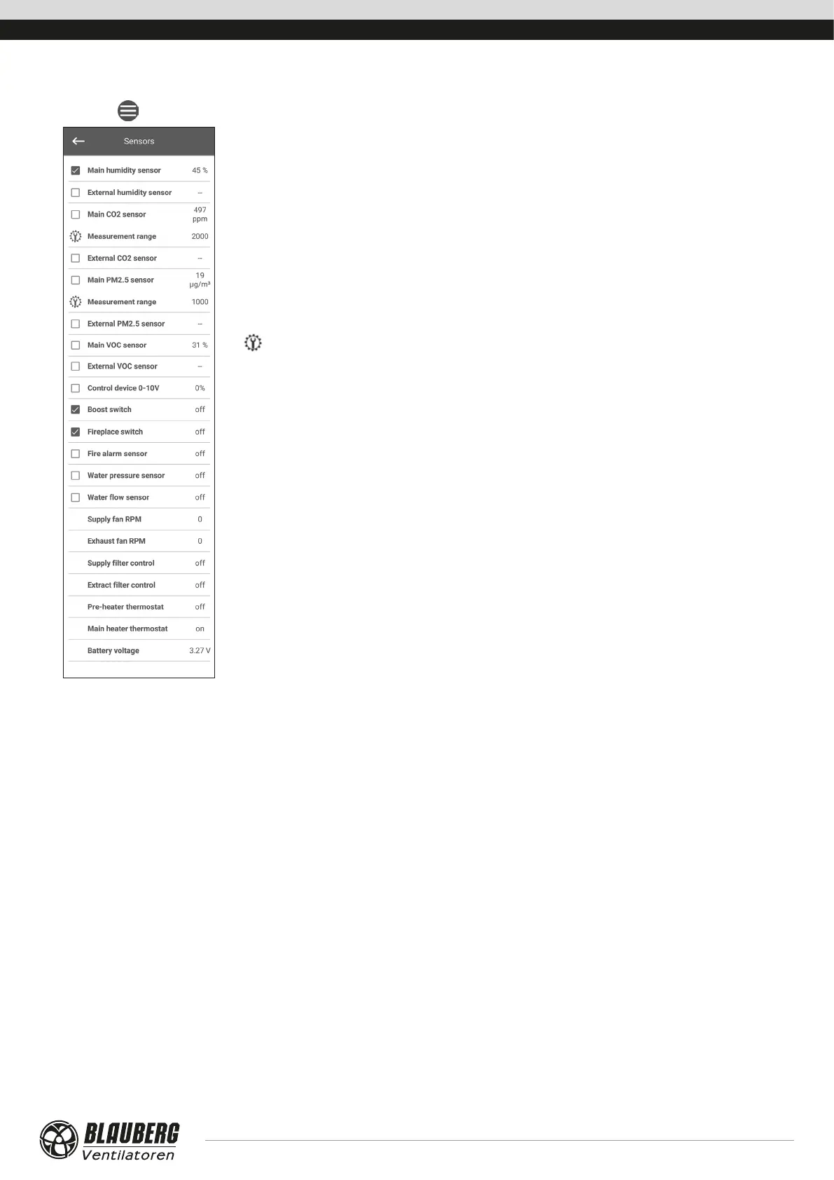 Depending on the unit configuration, the screen shows the supply/extract fan speed in rpm or
