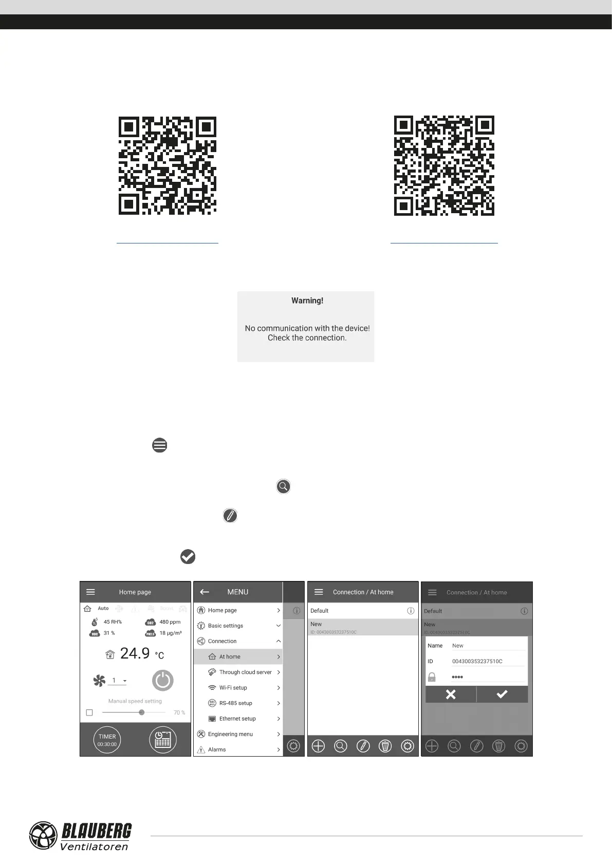 When starting the application, a message on the absence of communication with the fan appears on the screen if the device is not