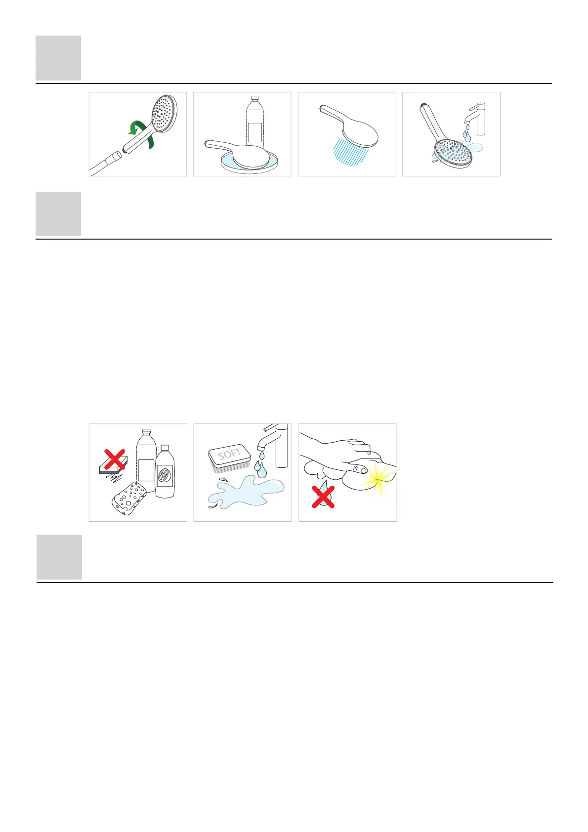 NL - Reinig uw doucheset met een vloeibaar, zacht reinigingsmiddel op basis van citroenzuur. BEHALVE de zwarte versie (enkel water en milde zeep
