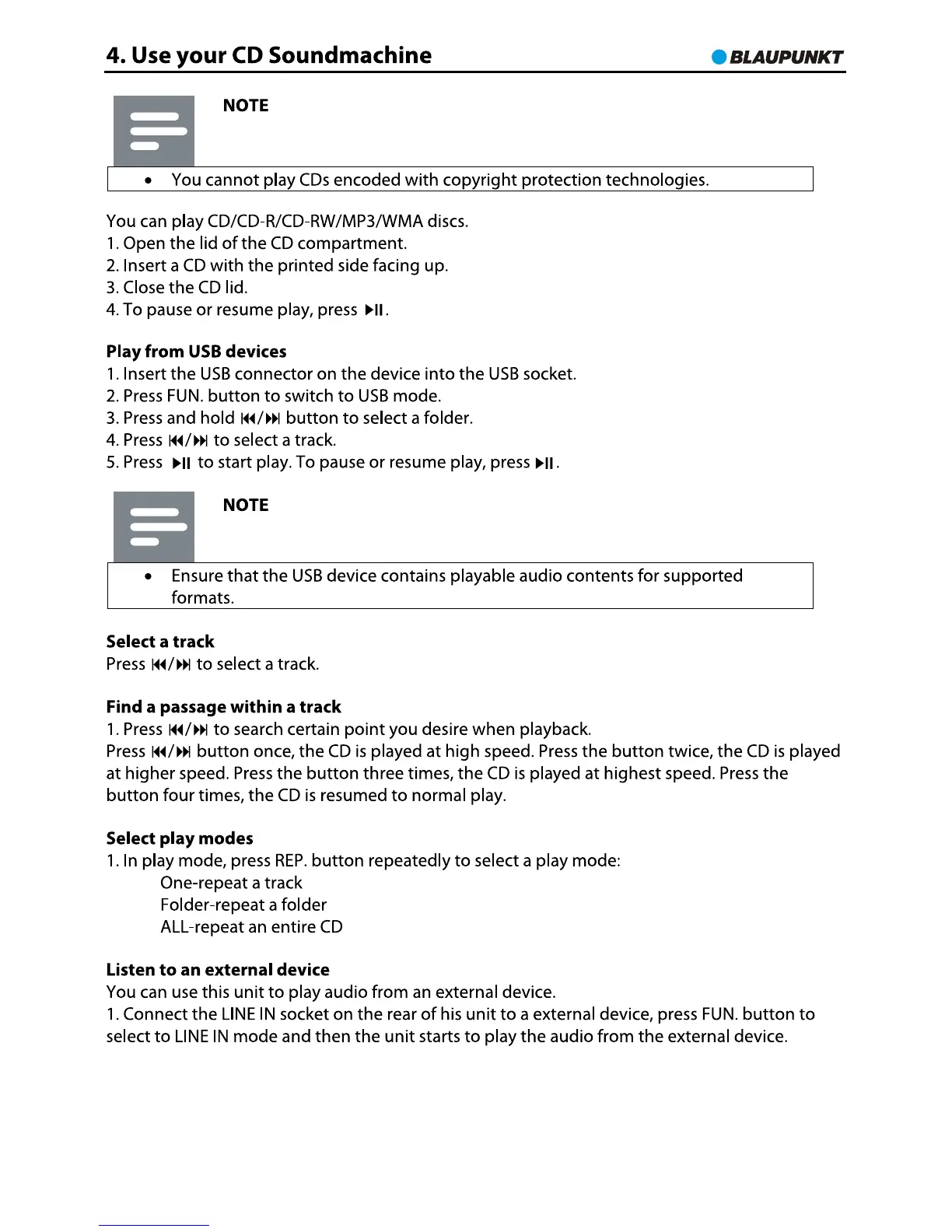 Blaupunkt BB12BK - 4. Using Your CD Soundmachine; Playing CDs; Playing from USB Devices