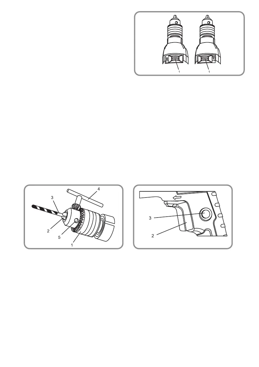• Bohrfutterschlüssel (4) in eines der drei Löcher (5) im Bohrfutter einstecken und gegen den Uhrzeiger drehen, bis die Bohrfut-