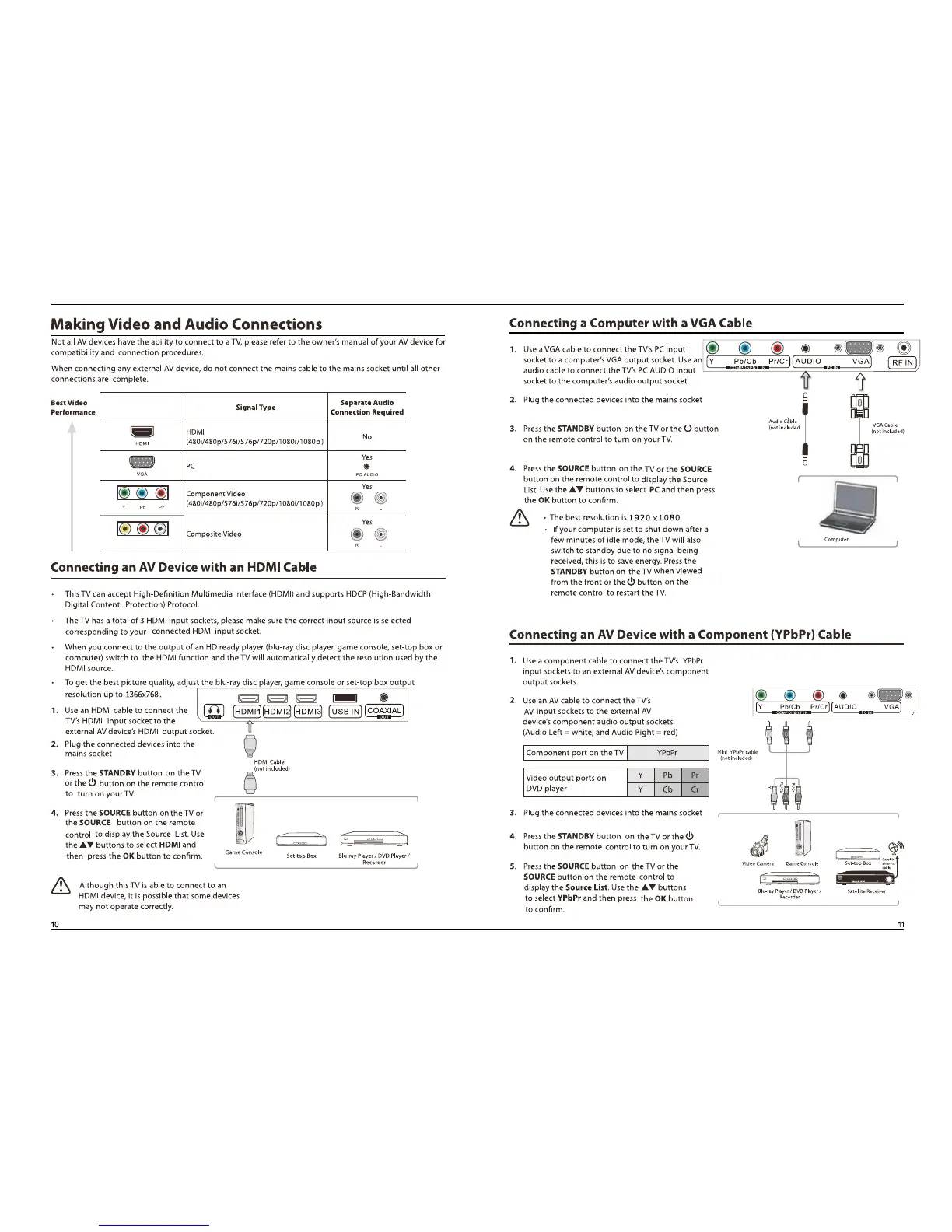 Blaupunkt BP4820FHD - Connecting External Video and Audio Devices; Connecting a Computer with VGA Cable; Connecting an AV Device with HDMI Cable; Connecting an AV Device with Component Cable