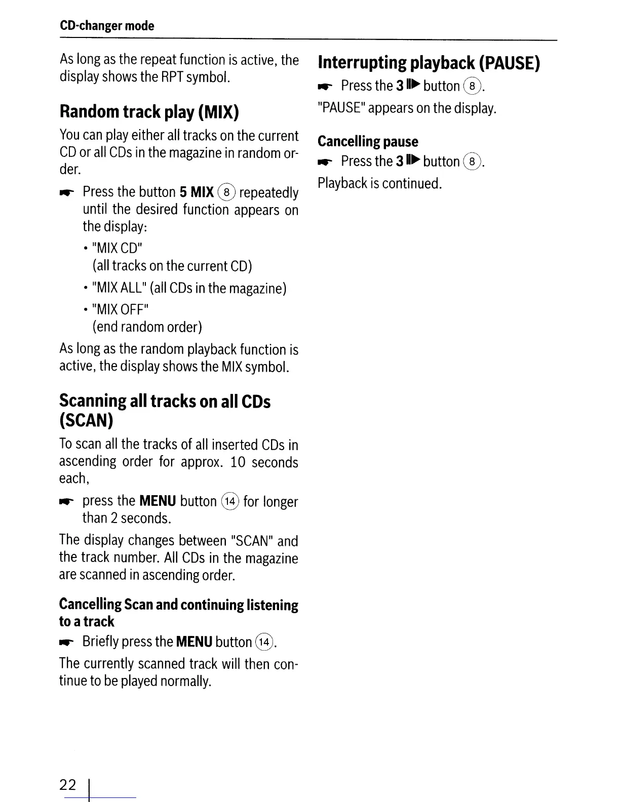 Blaupunkt Brisbane SD48 - Random track play (MIX); Scanning all tracks on all CDs (SCAN); Cancelling Scan and continuing listening to a track