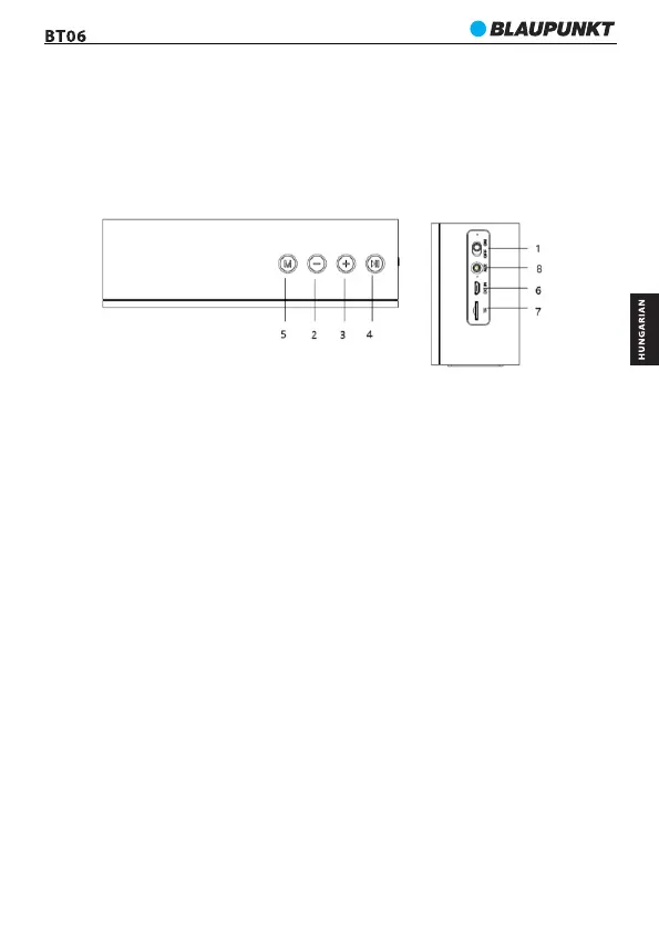 5.Mode gomb: Röviden nyomja meg a bluetooth / FM / micrSD és AUX IN módok közötti