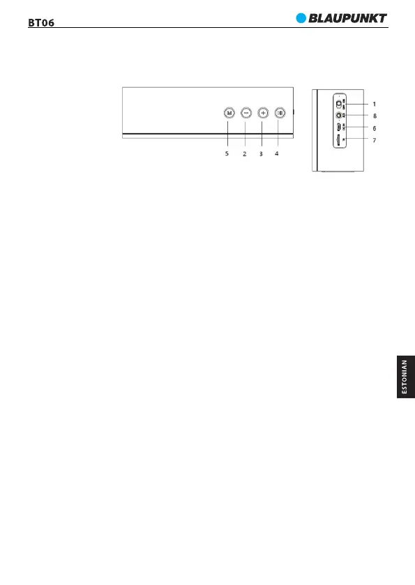 5.Nupp Mode: vajutage lühidalt bluetooth / FM / microSD ja AUX IN mängimise režiimide vahel