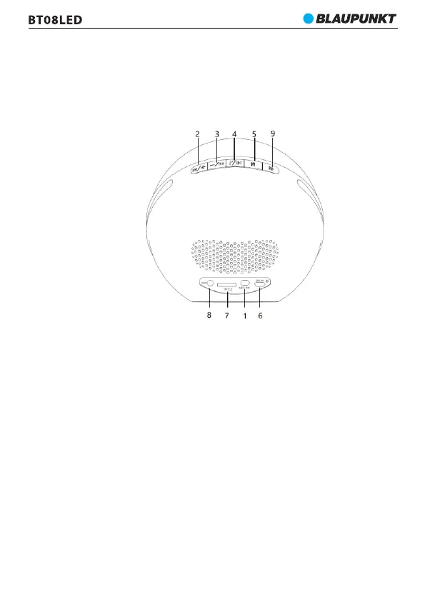 5.ť režim prehrávania medzi Bluetooth / FM / microSD a AUX IN, stlačte krátko.