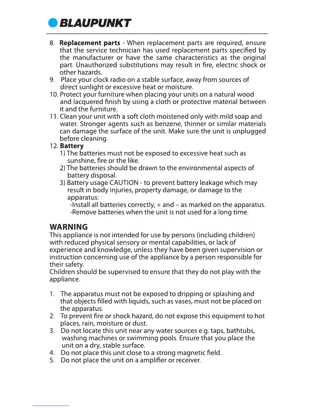 Blaupunkt CR12 - Usage and Safety Guidelines; Replacement Parts; Battery Usage and Safety