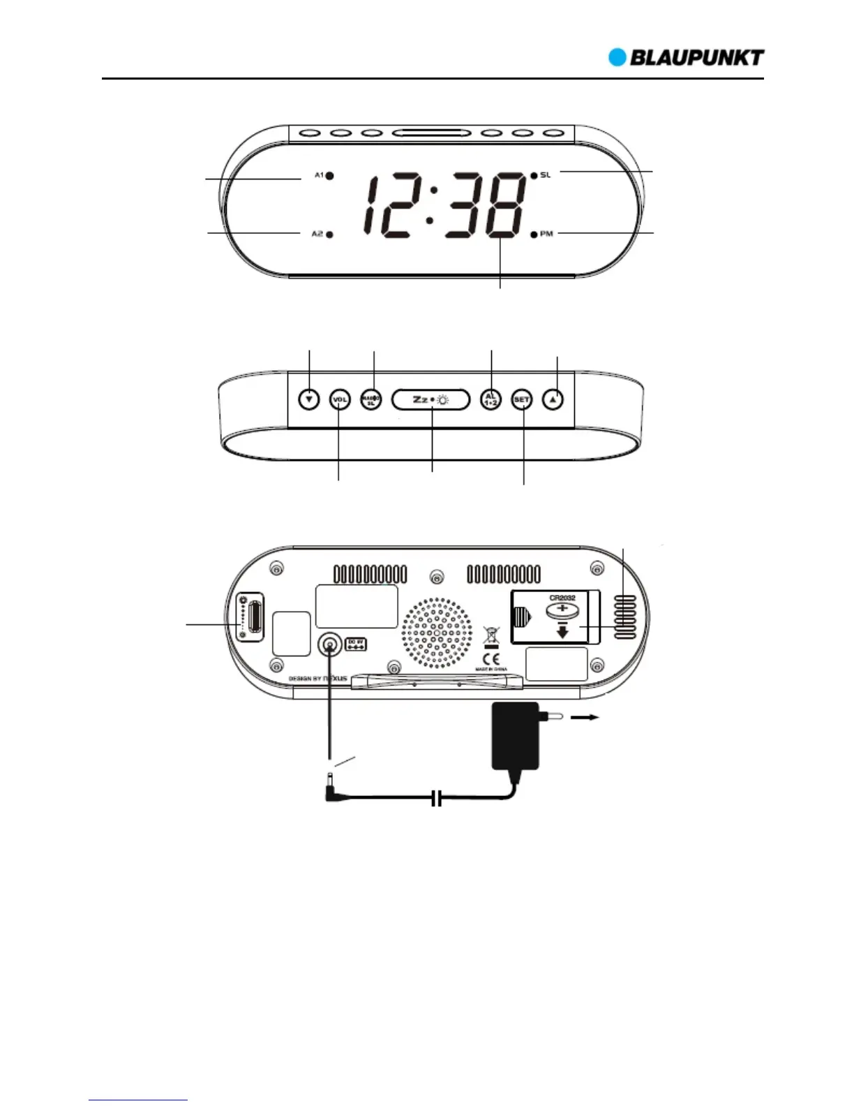 konektor síťového adaptéru do zdířky DC na zadní straně přístroje. Radiobudík se zapne a je