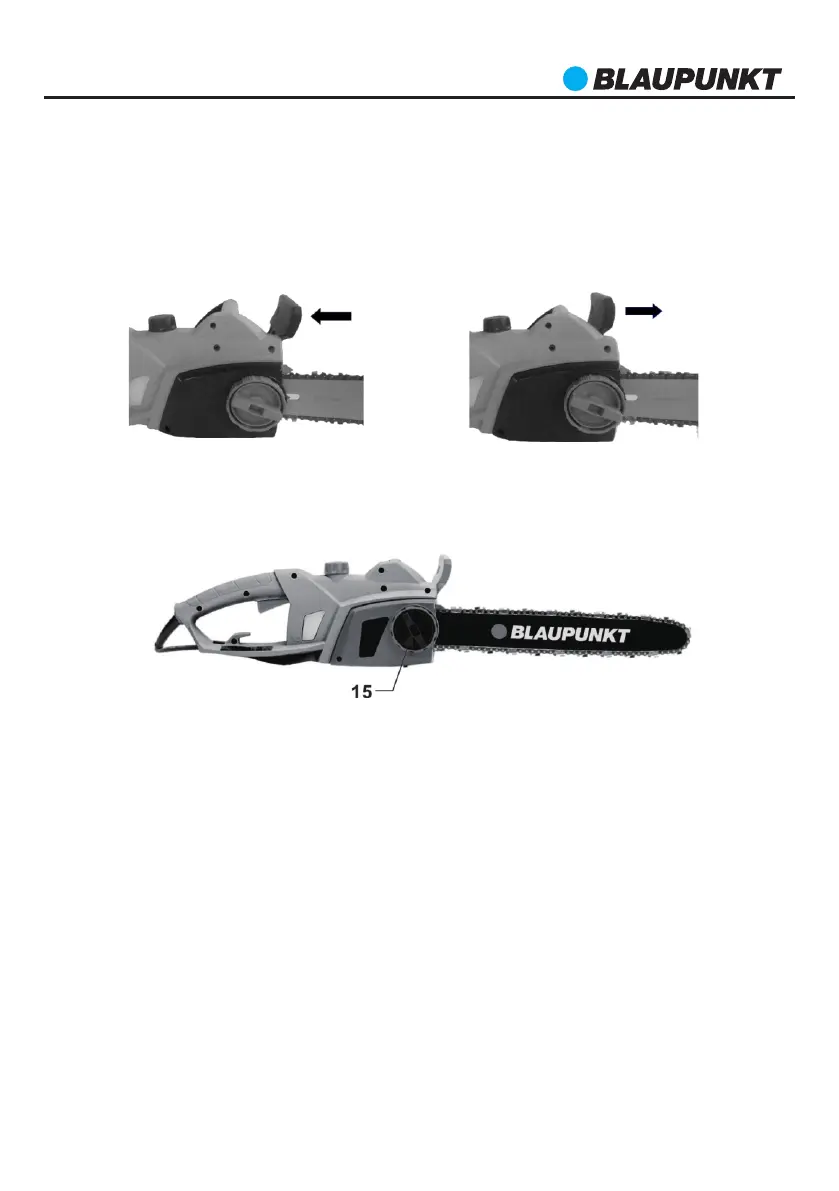 Prieš kiekvieną pjūklo naudojimą patikrinkite grandinės stabdžio veikimą pastumdami svirtį į priekį.