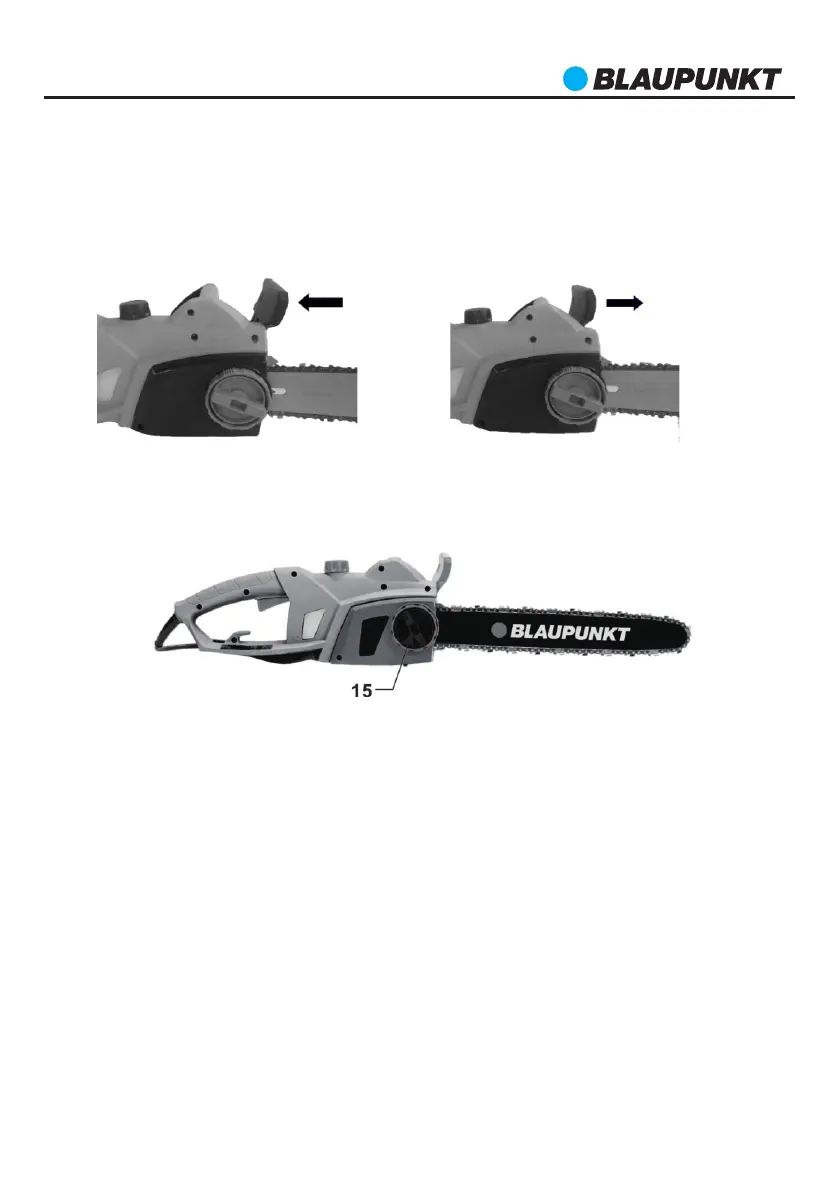 napájení. Nastavte brzdu řetězu do svislé polohy.