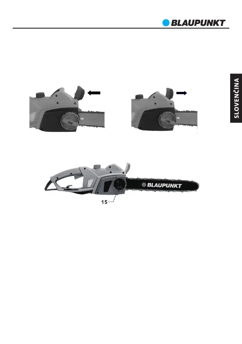 odpojené od el. napätia. Potom nastavte brzdu reťaze v zvislej polohe.