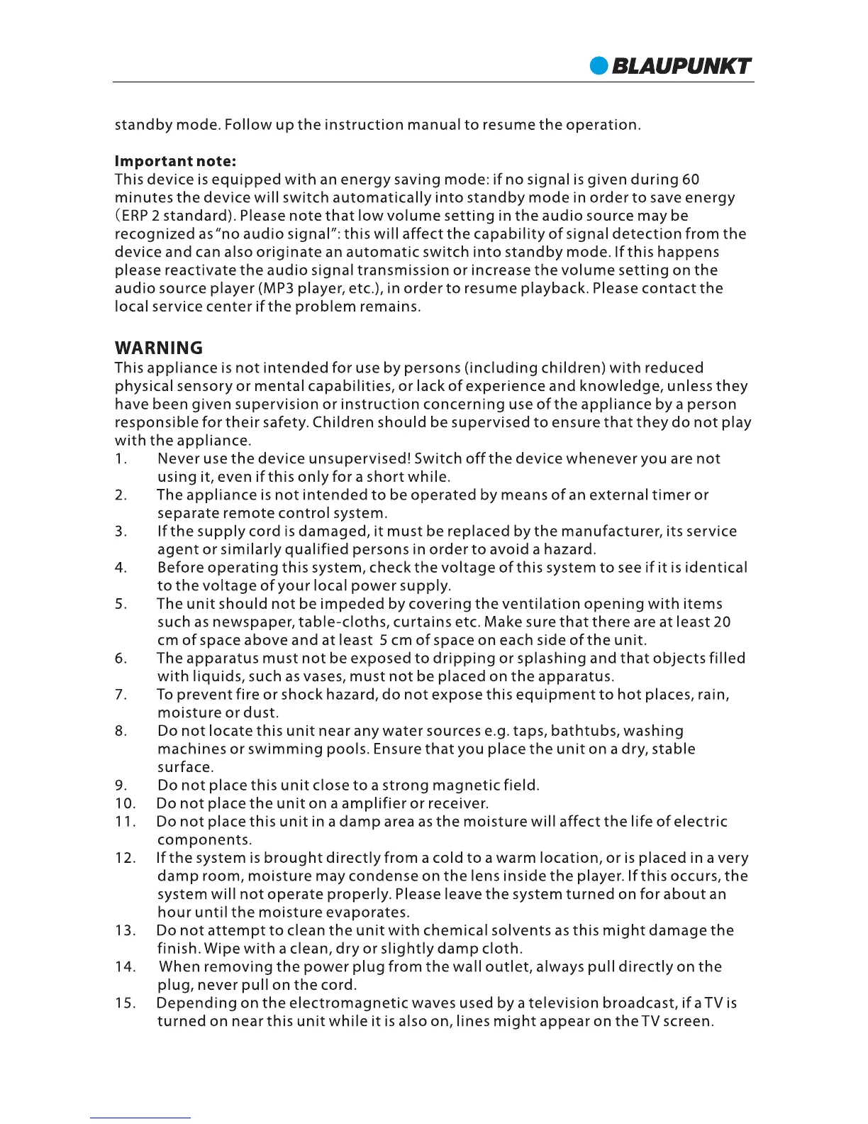 Blaupunkt HR50DAB - General Warnings and Precautions; Usage Supervision and Cord Safety