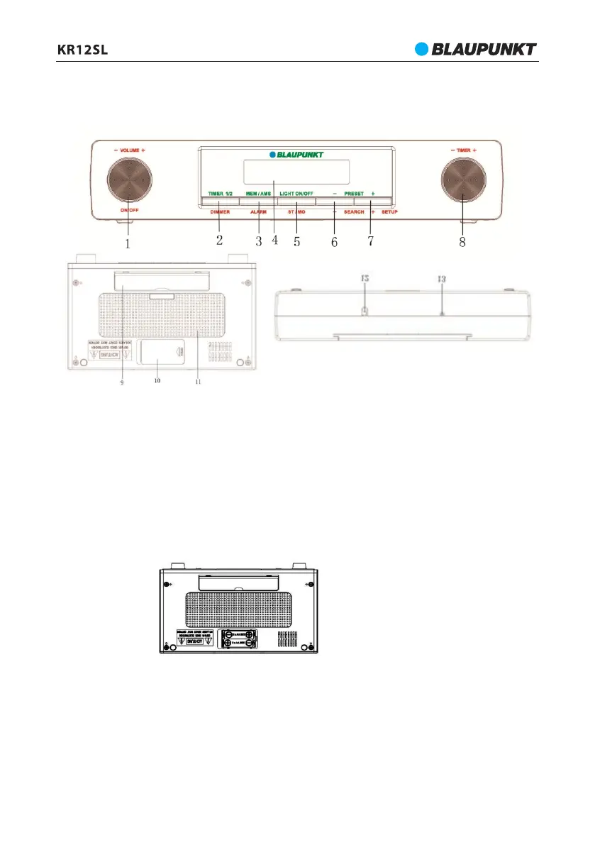 1-Pokretło regulacji głośności /włączanie /; 2- Timer 1/2 / Ściemniacz;3-Alarm/pamięć/AMS( skanowanie);4- Wyświetlacz;
