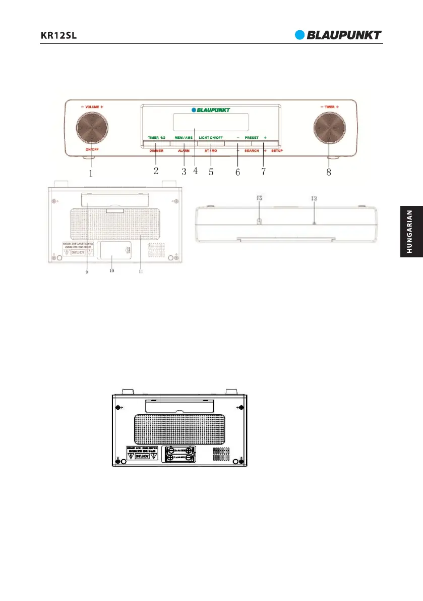 1-Hangerőszabályozó gomb/bekapcsolás/kikapcsolás; 2- Időzítő Timer 1/2 / Világosító;3-Ébresztő/memória/AMS(beolvasó);