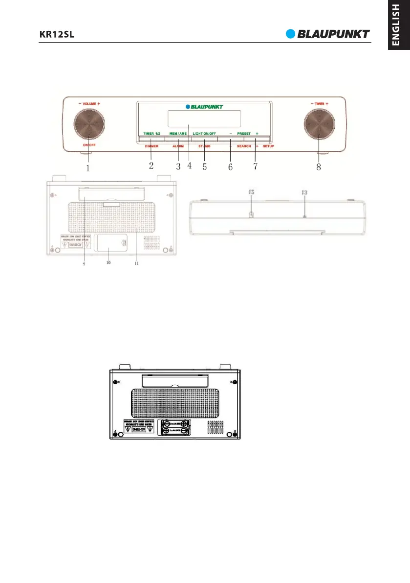 6-Preset-/search –;7- Preset +/search +/setup;8-Timer;9-Foldable stand;10-Battery compartment;11- Speaker