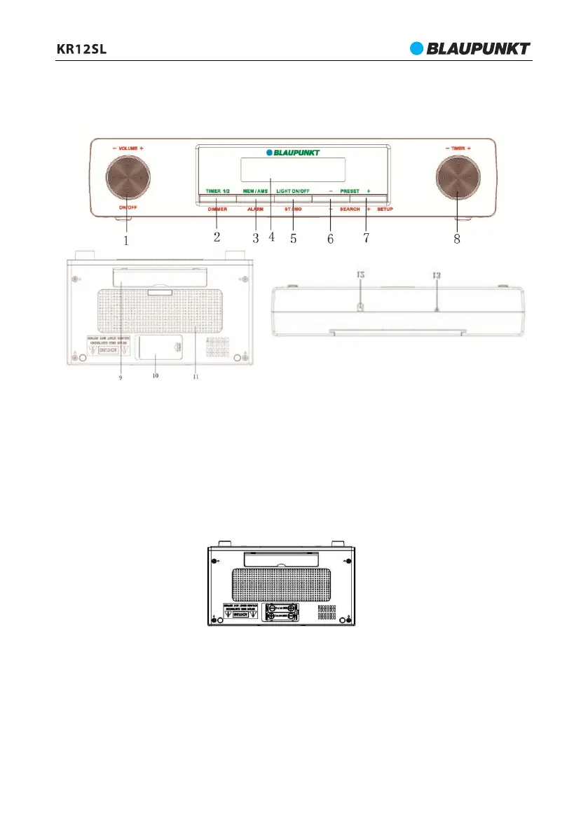 10 - Prostor za baterijo; 11 - Zvočnik; 12 - Napajalni vod; 13 – Antena FM