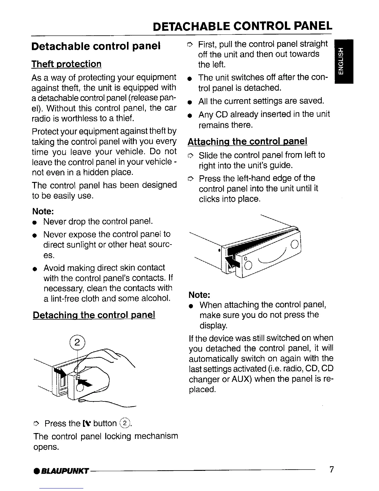Blaupunkt Laguna CD35 - Detachable Control Panel; Theft Protection; Detaching the Control Panel; Attaching the Control Panel