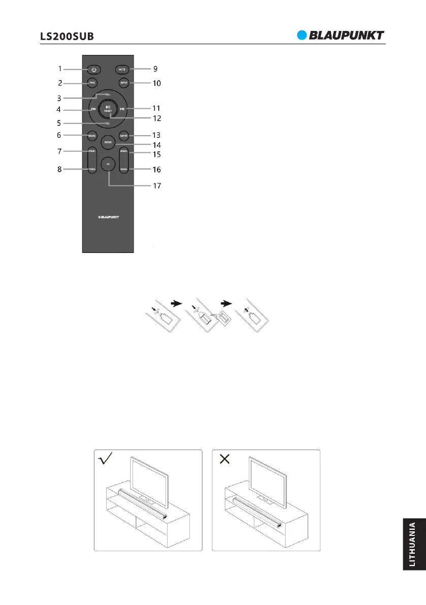 b. Išsikrovus elementams, nuotolinio valdymo pulto jautrumas sumažės. Tada juos būtina pakeisti naujais.