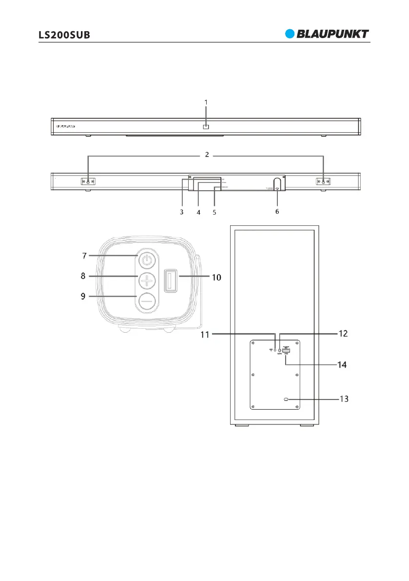 2 – Rögzítőkonzol; 3 – AUX bemenet; 4 – Optikai bemenet; 5 – HDMI (ARC) aljzat;
