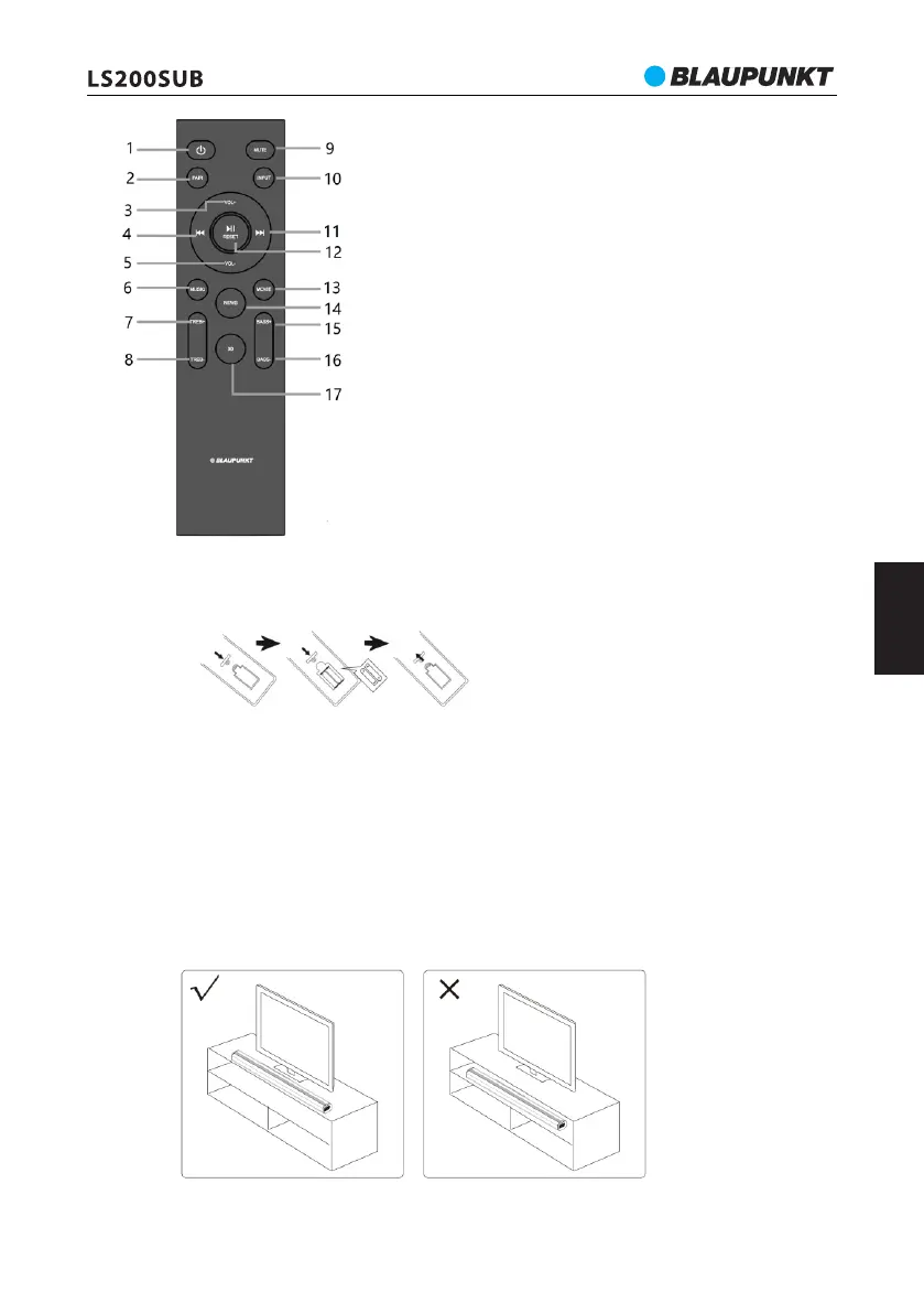 a. Najbolja radna udaljenost za daljinski upravljač je 5 metara, bez prepreka između daljinskog upravljača i zvučne trake. Kad
