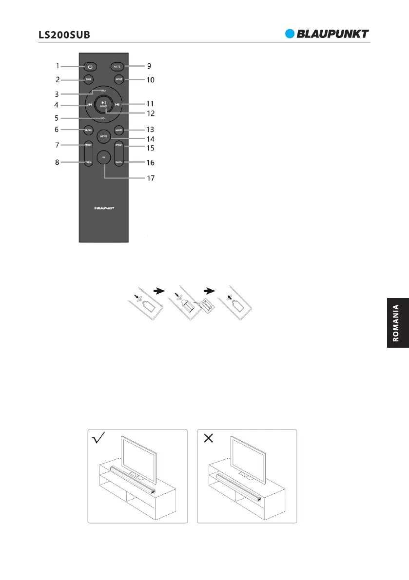 b. Sensibilitatea telecomenzii va scădea atunci când bateriile sunt descărcate. Apoi, acestea ar trebui înlocuite cu altele noi.