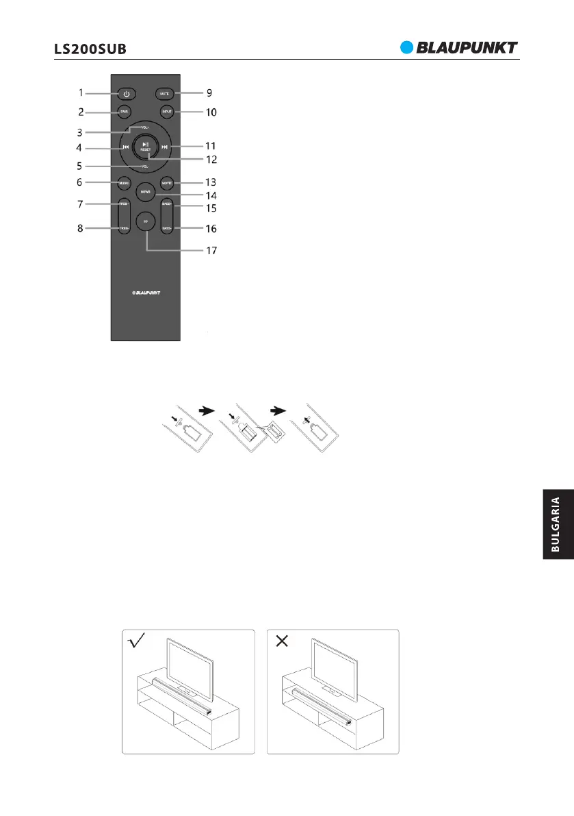 дистанционно управление, разположен в предната част на саундбара.