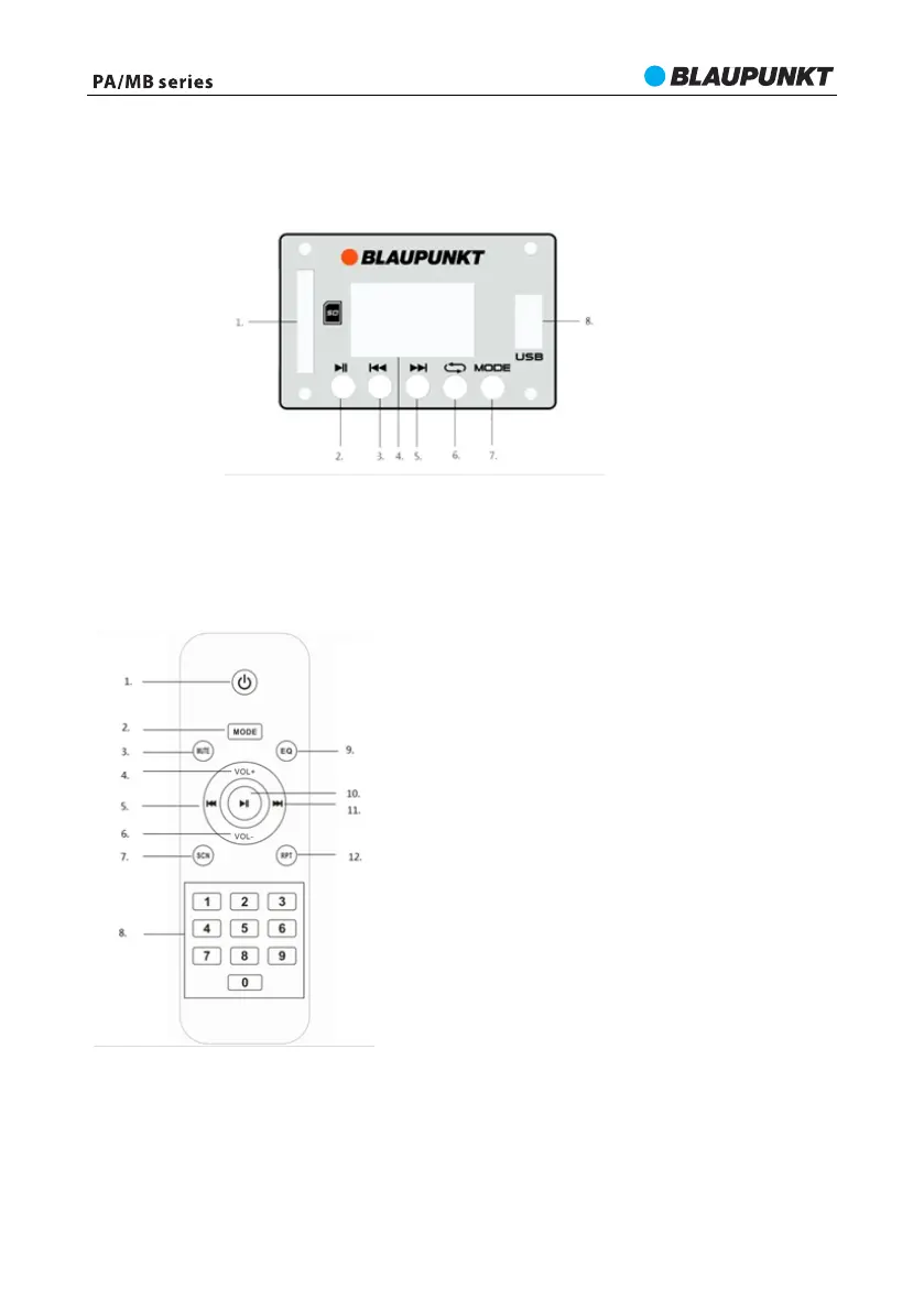 1- SD kartes ieeja. 2- Atskaņošanas/pauzes poga. 3- Poga “Iepriekšējā”. 4- Displejs.