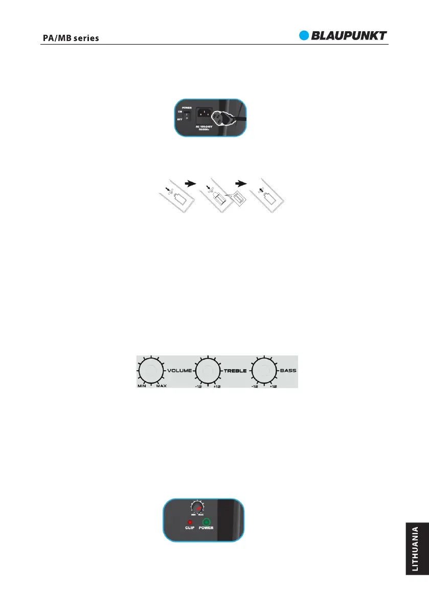 skyriuje nurodytus teigiamus ir neigiamus simbolius. Po to uždarykite baterijų kameros dangtelį.