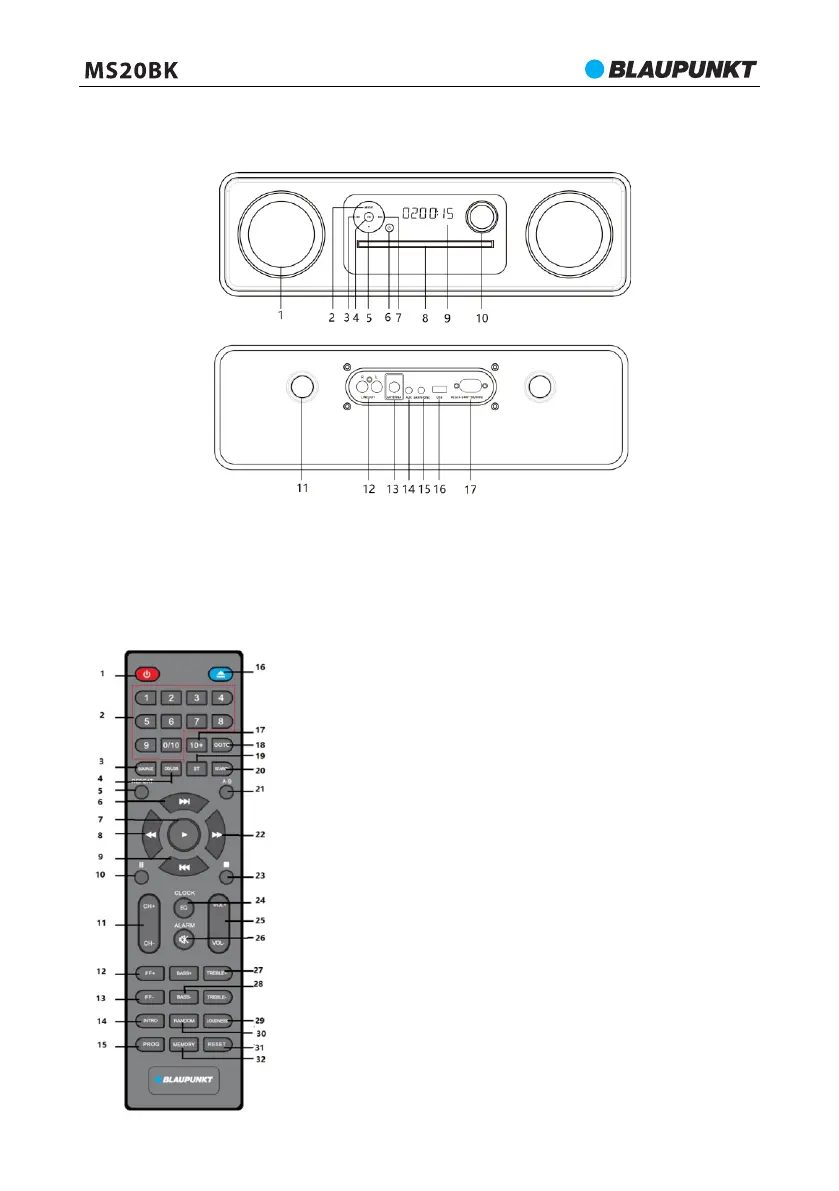 13 - FM antenna aljzat 75 ohm; 14 - AUX IN aljzat; 15 - Fülhallgató aljzat; 16 - USB aljzat;