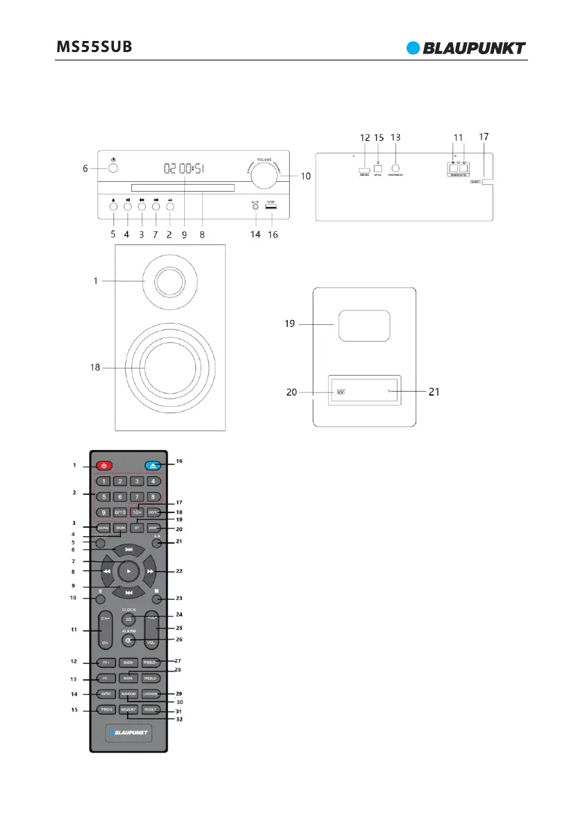 16 - Port USB; 17 - Wejście zasilania AC; 18---głośnik średnio-niskotonowy;