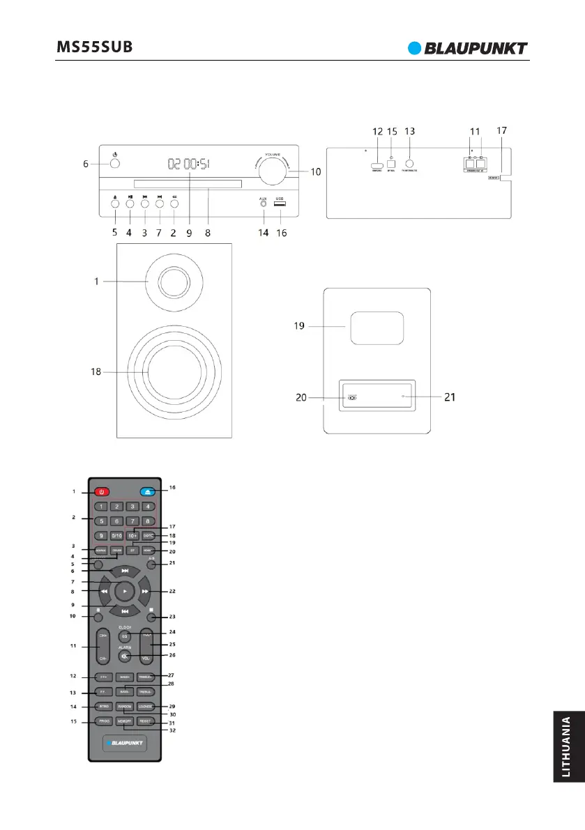 19—Bluetooth; 20—FM dažnio paieška; 21—A-B kūrinio fragmento kartojimas;